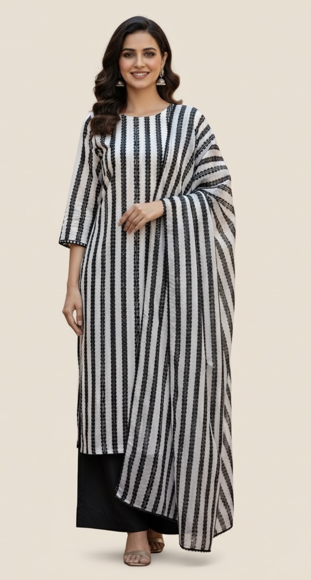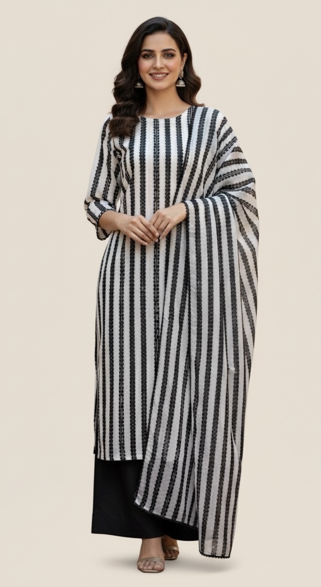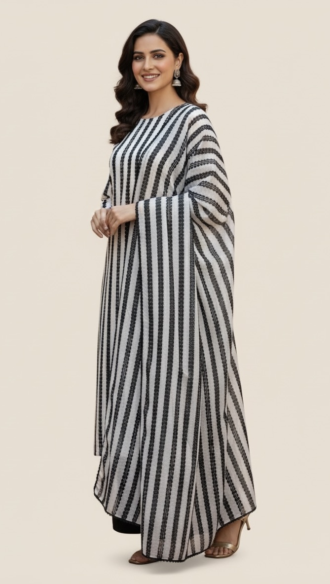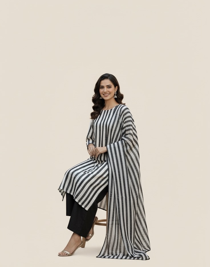 Sleek, chic, and absolutely striking! Embrace the power of print with the Aks-e-Roshni Linea B&W dress. Vertical stripes and solid black trousers make this look a modern masterpiece.