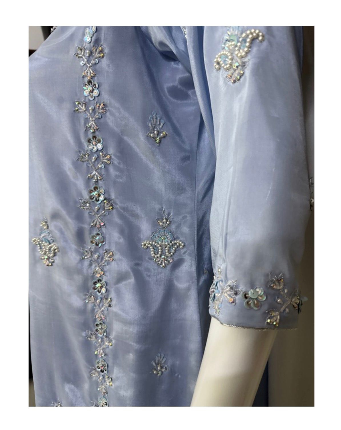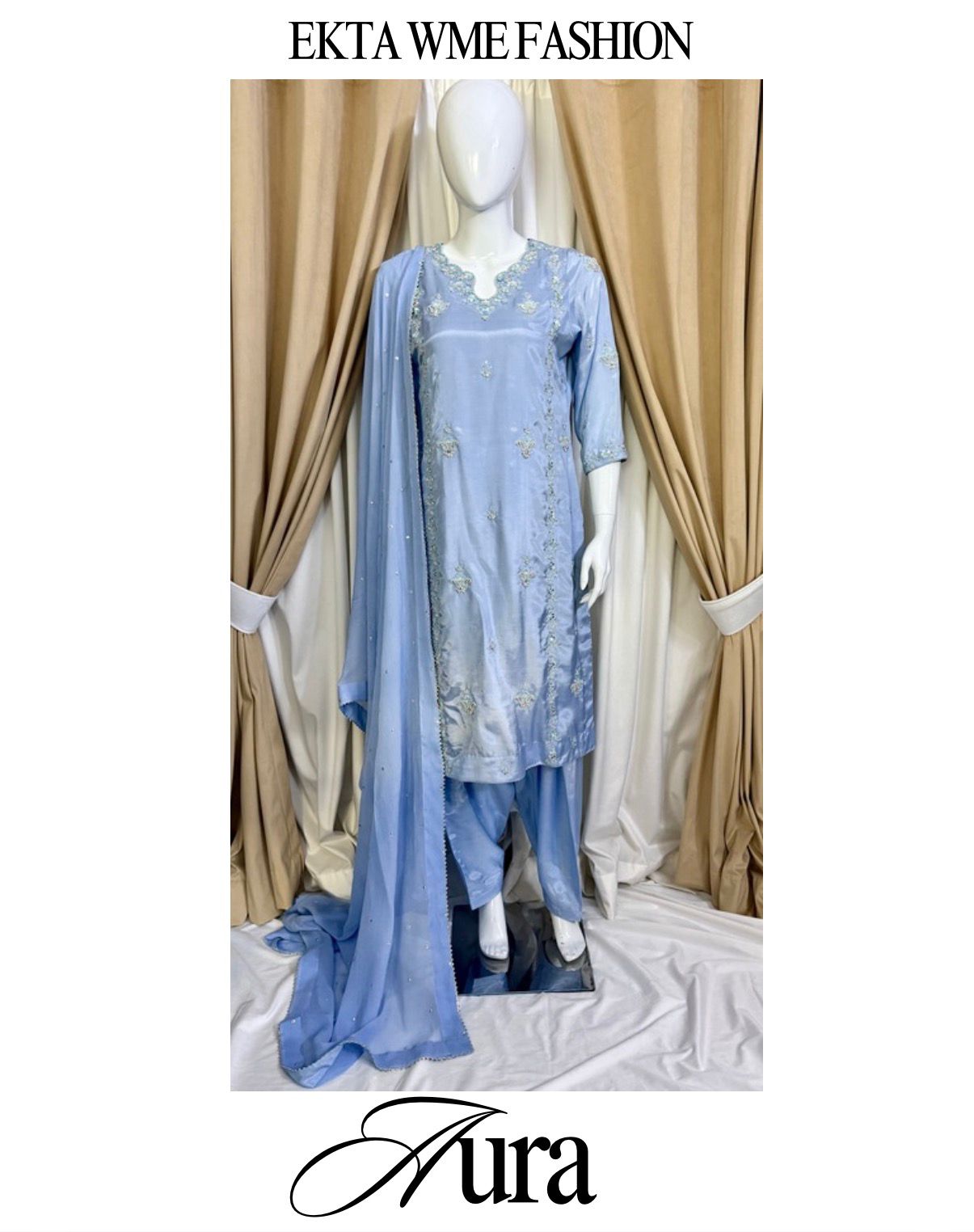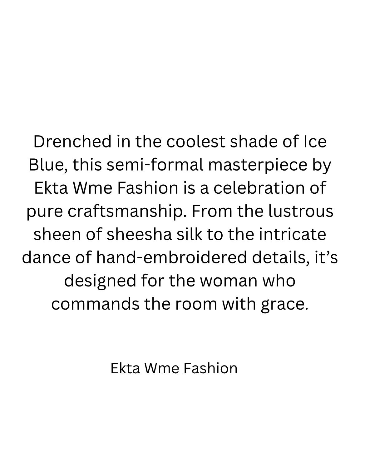 Elevate your festive wardrobe with “Aura,” a signature piece from Ekta Wme Fashion. This semi-formal ensemble strikes the perfect balance between modern silhouettes and traditional hand-embroidery. The cooling ice blue tone provides a refreshing aesthetic, making it a standout choice for weddings, dinners, or evening soirĂ©es.