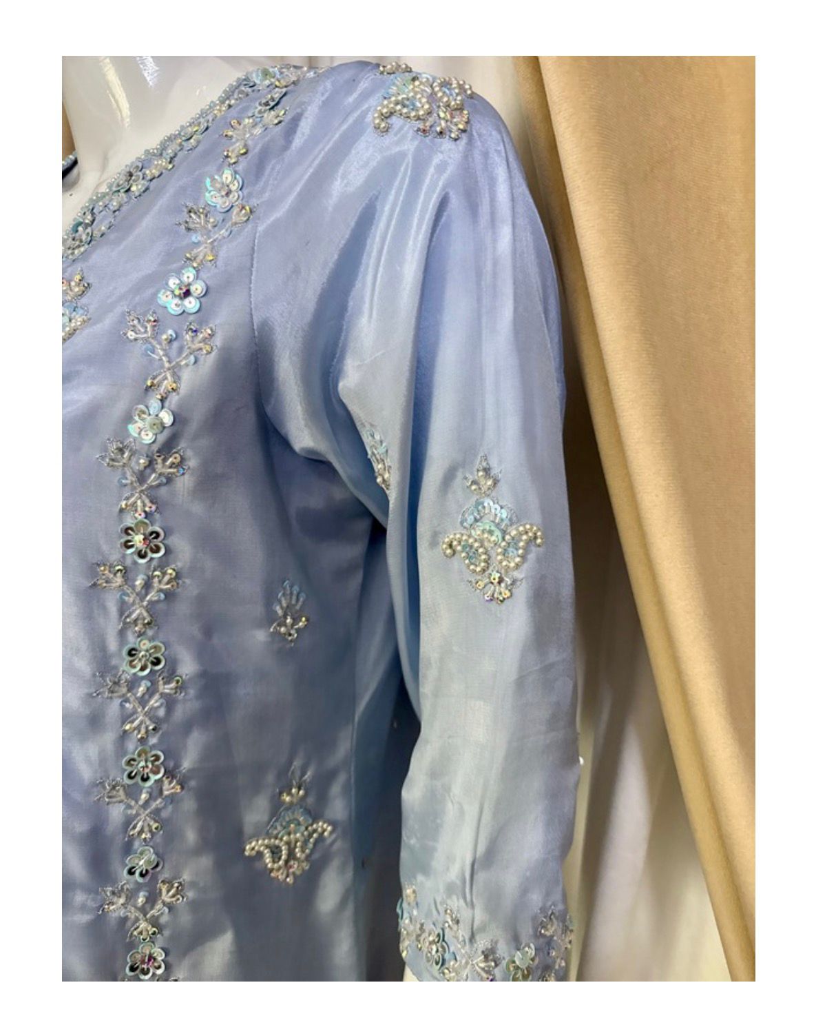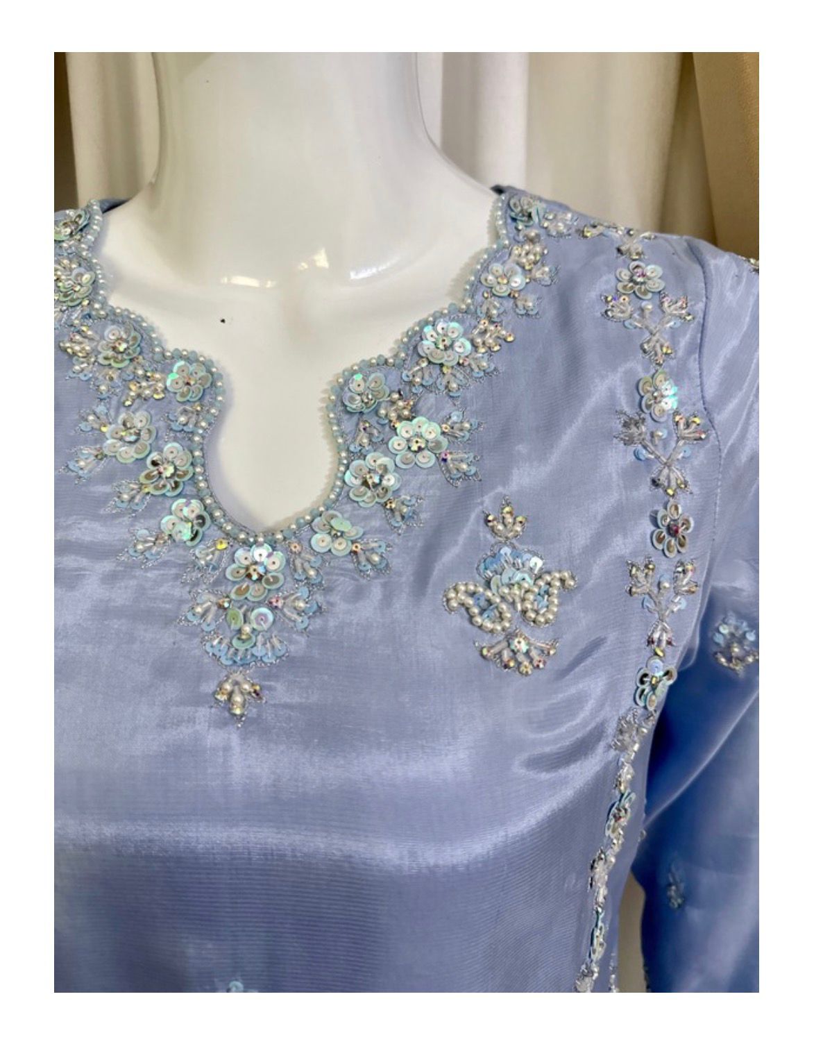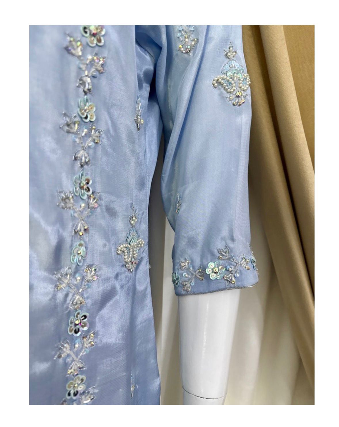 Elevate your festive wardrobe with “Aura,” a signature piece from Ekta Wme Fashion. This semi-formal ensemble strikes the perfect balance between modern silhouettes and traditional hand-embroidery. The cooling ice blue tone provides a refreshing aesthetic, making it a standout choice for weddings, dinners, or evening soirĂ©es.