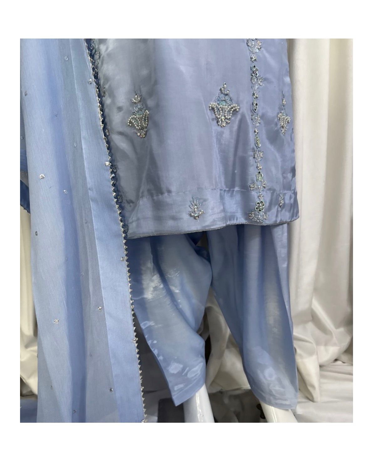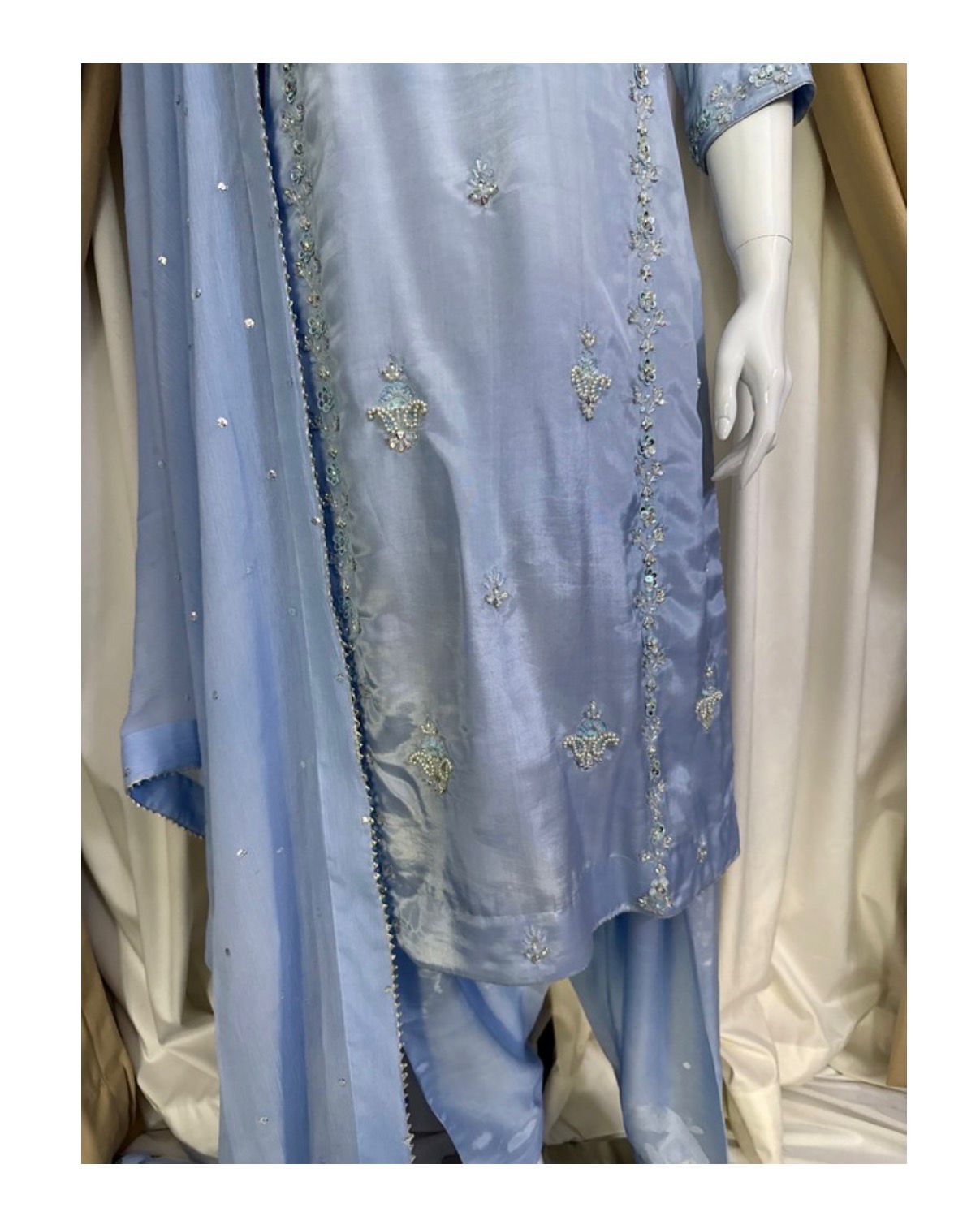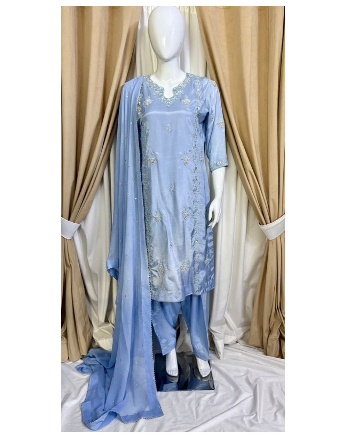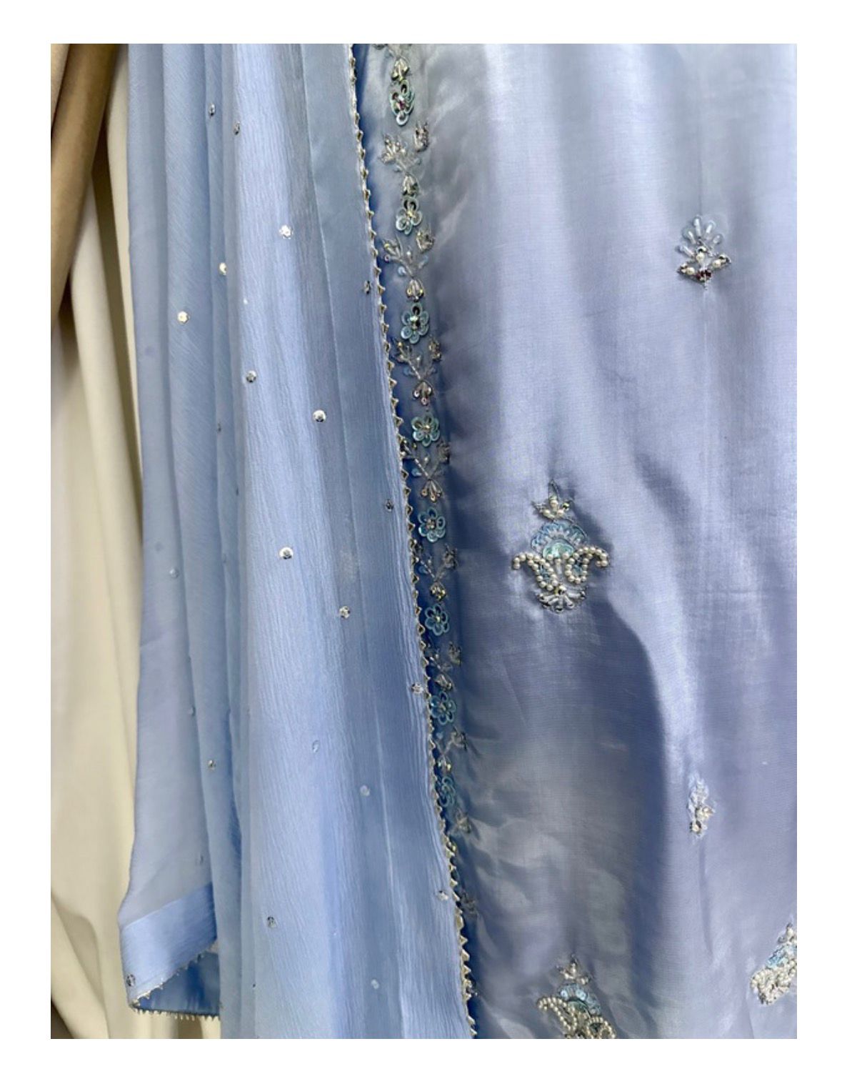 * The Dupatta: A lightweight Pure Chiffon dupatta featuring a delicate “sequin chan” (sprinkle) and finished edges to add a touch of whimsical movement to your look.