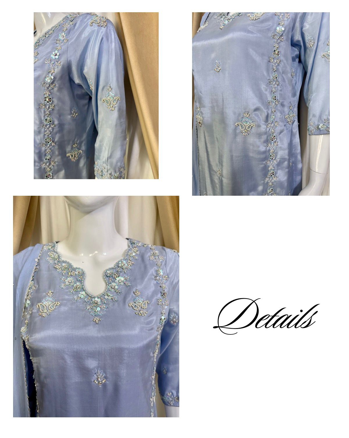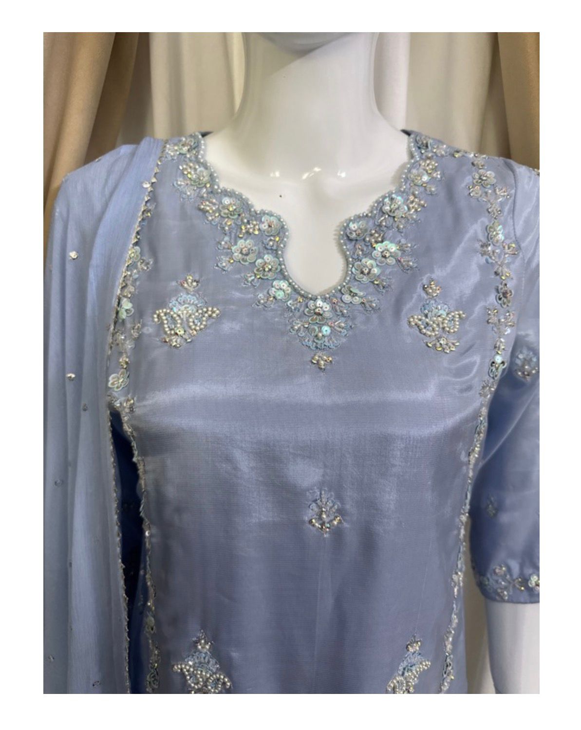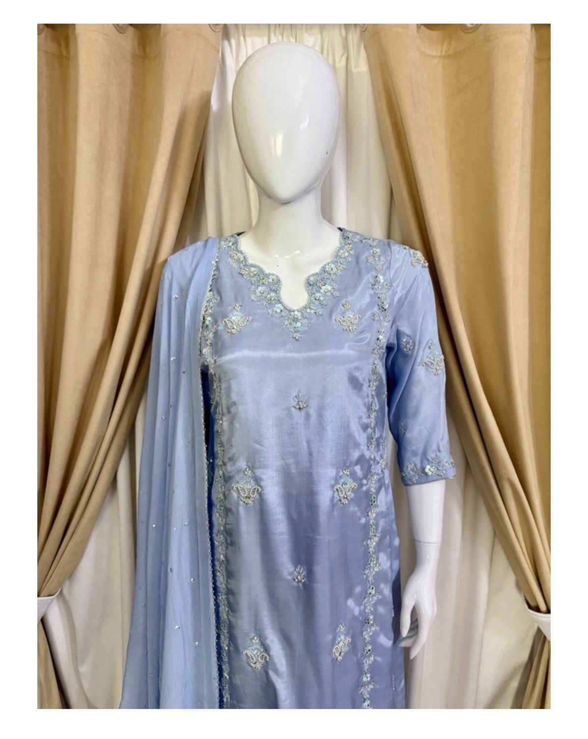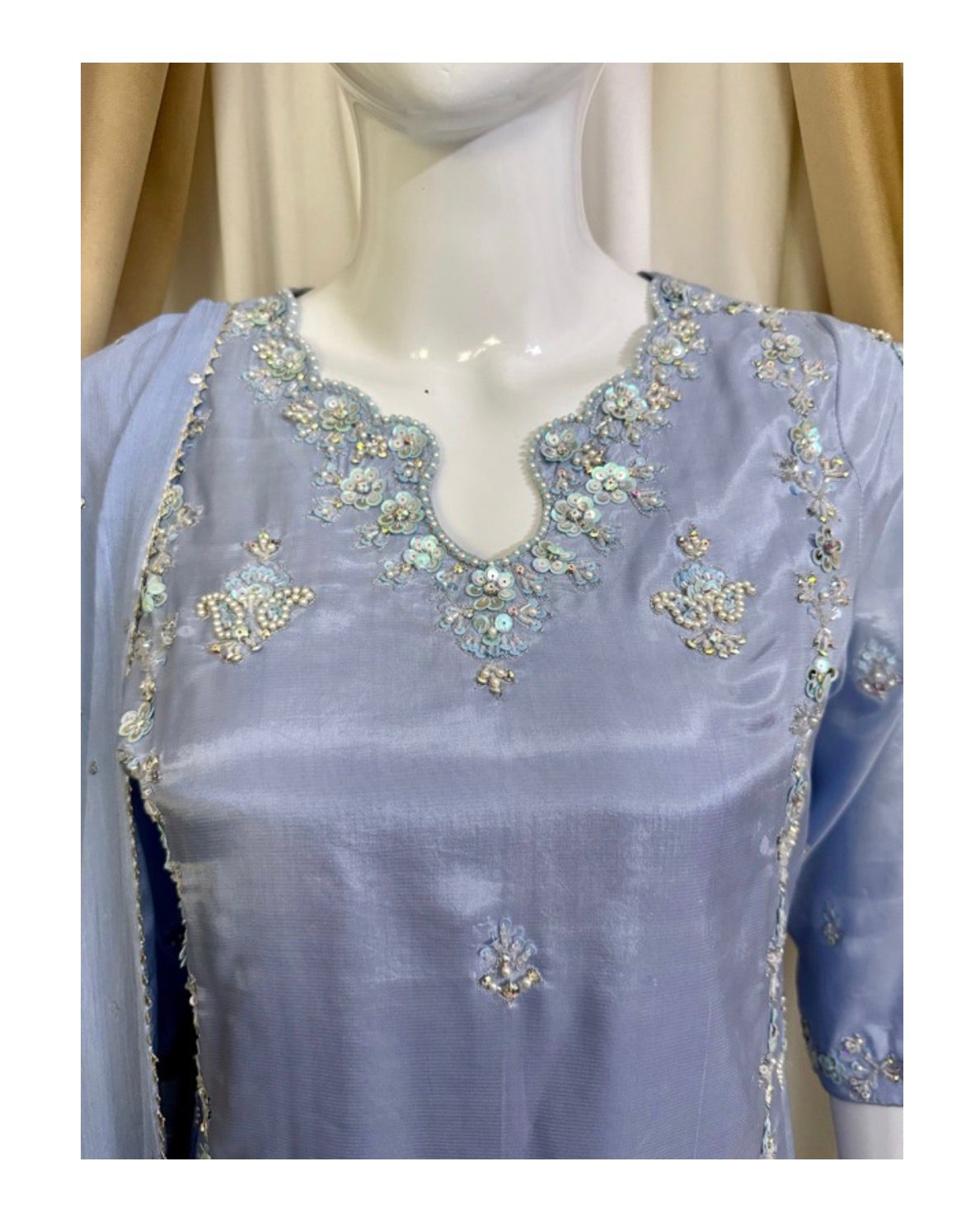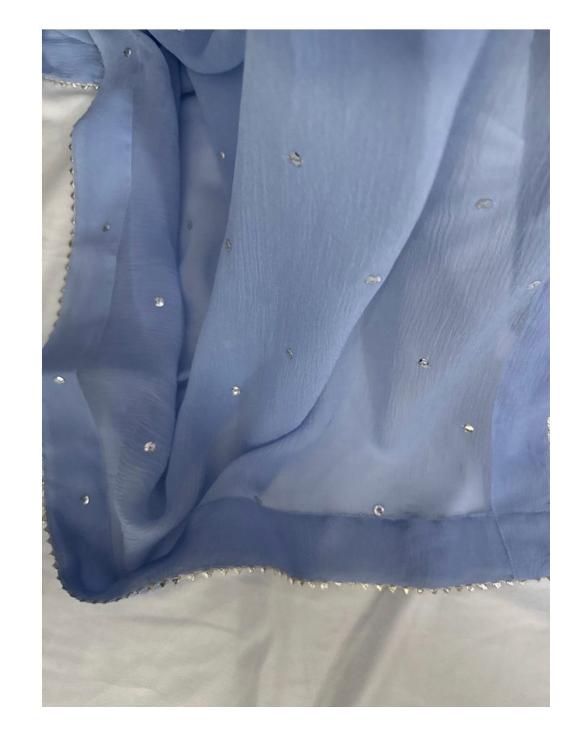 * The Dupatta: A lightweight Pure Chiffon dupatta featuring a delicate “sequin chan” (sprinkle) and finished edges to add a touch of whimsical movement to your look.
