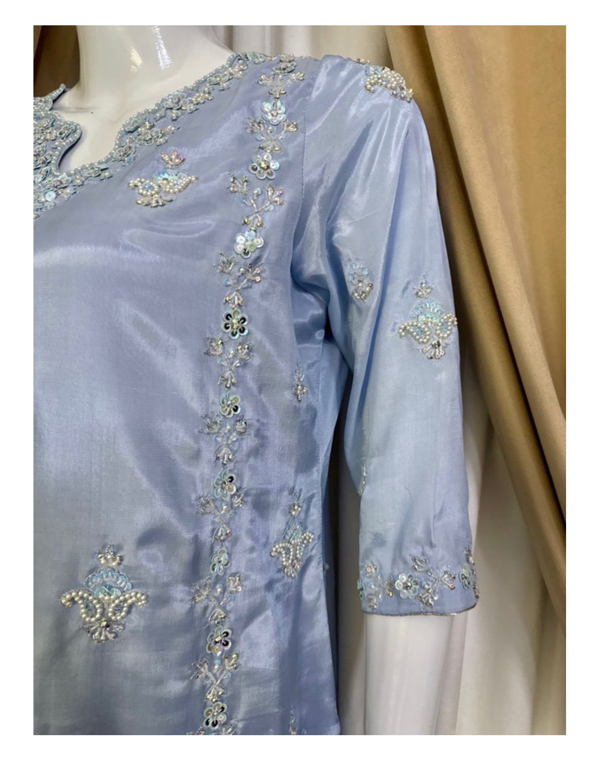 * The Kurta: Crafted from high-quality Sheesha Silk, the shirt features a modern neckline and side-panel embroidery. The artisanal work includes a meticulous arrangement of katdana, tila, and pearls, accented by the shimmer of crystals and tiki stones.