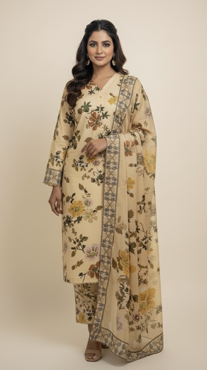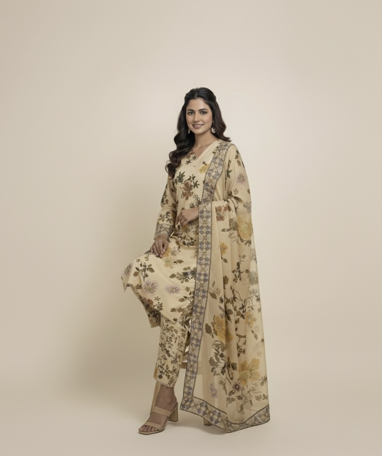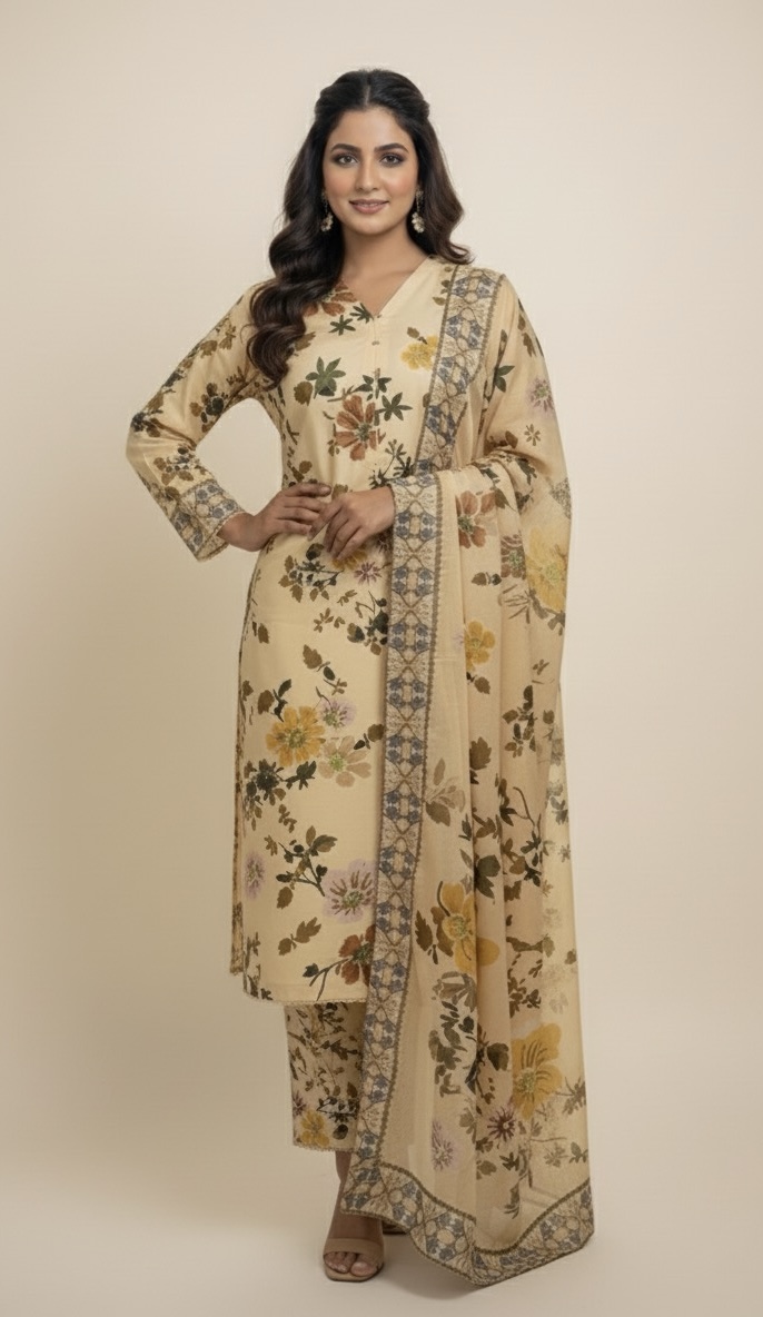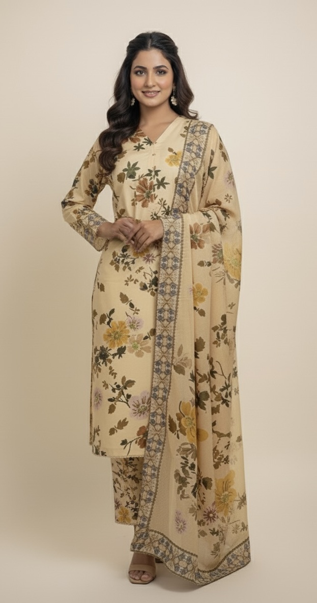 Subtle sophistication with a floral flair! This skin-toned suit and its beautiful yellow-accented dupatta are the perfect blend of warmth and style. Effortlessly elegant and utterly timeless.