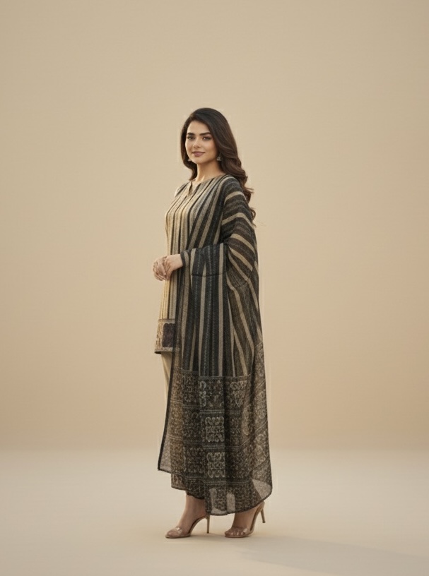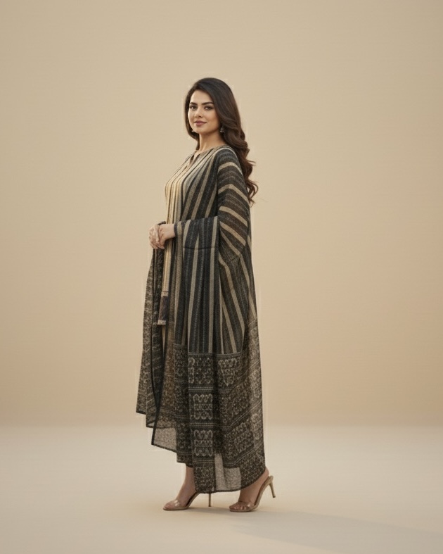 The Rang Raiza dress features sophisticated stripes, rich patterned borders, and a striking black dupatta. Effortlessly elegant and perfectly put-together.
