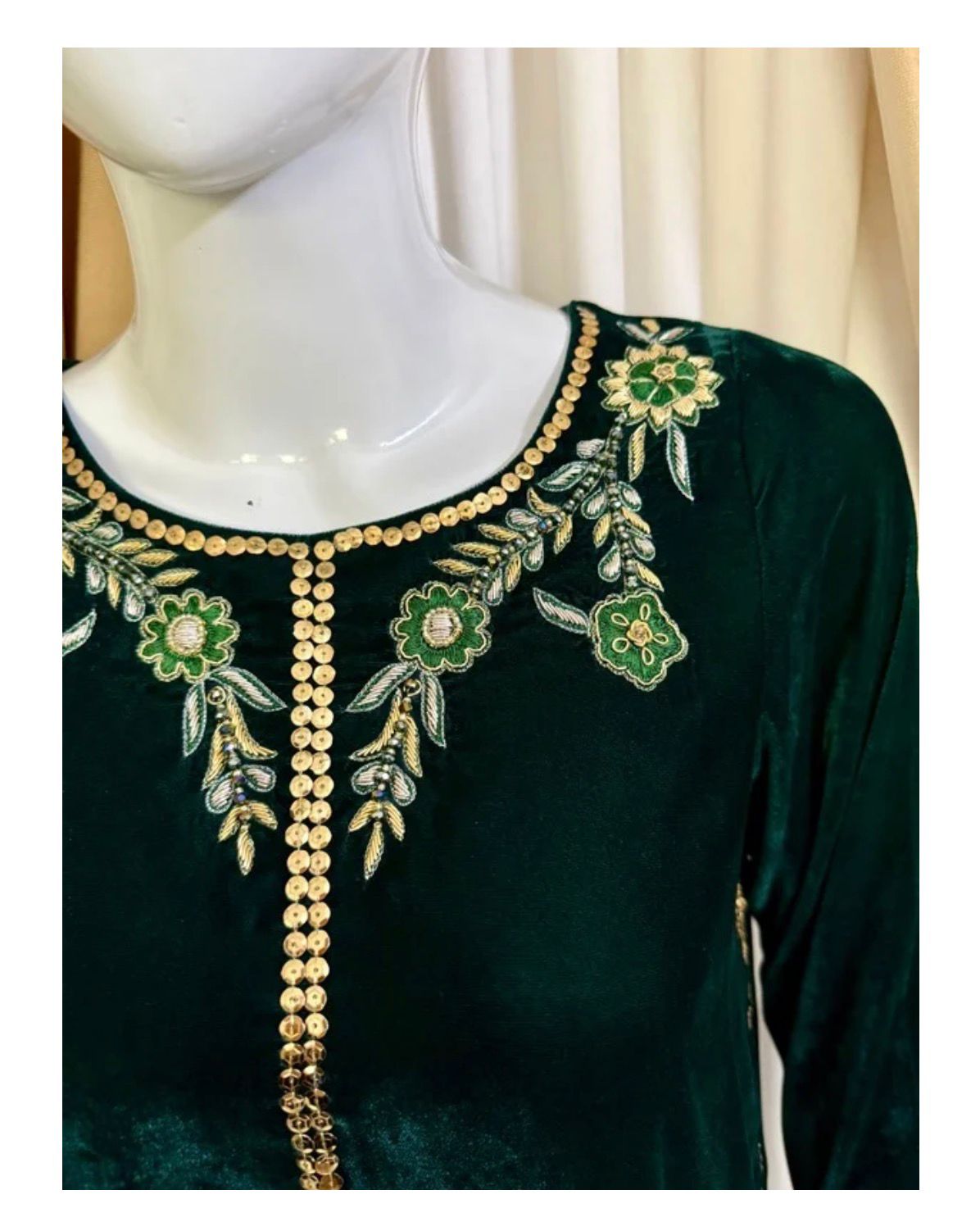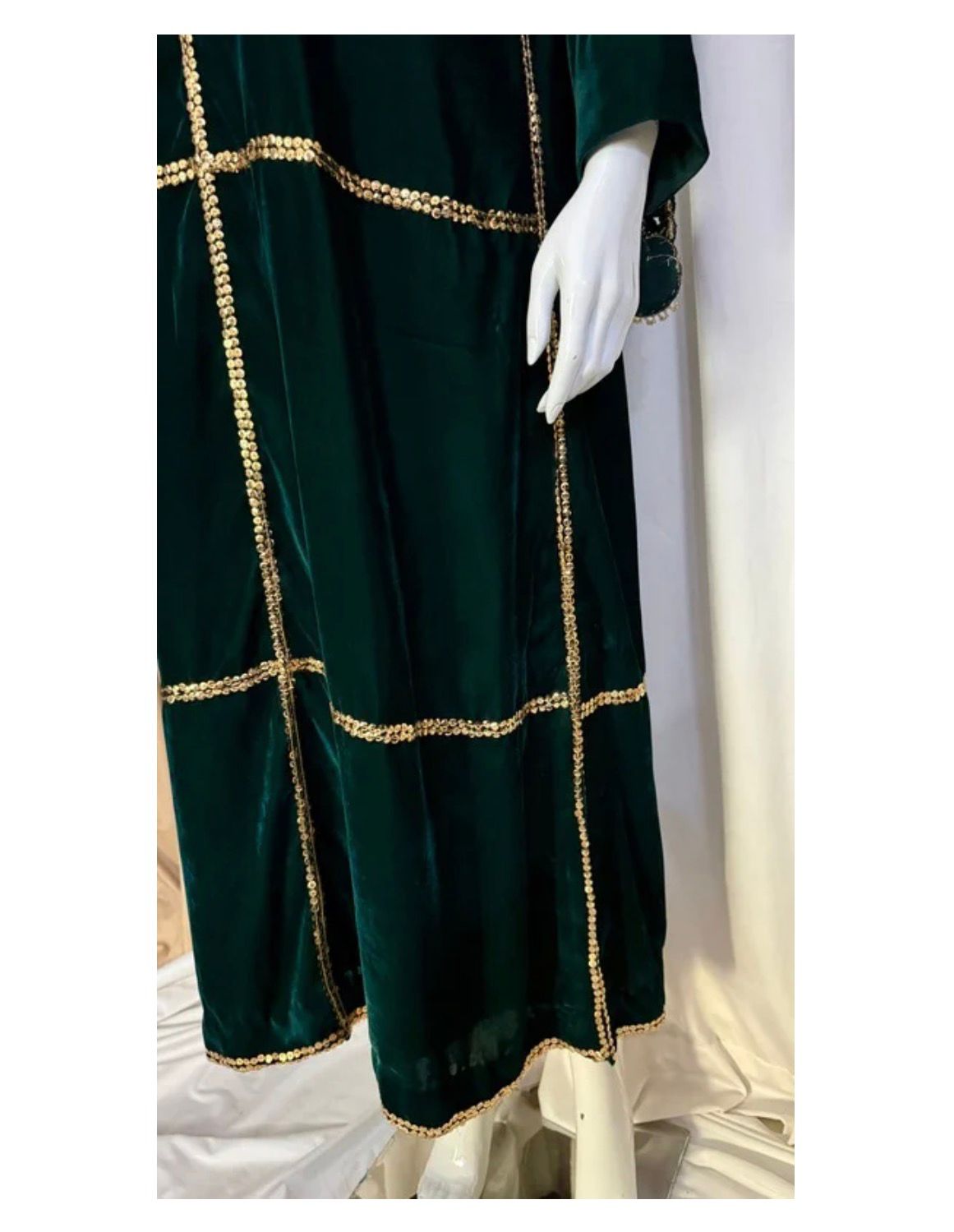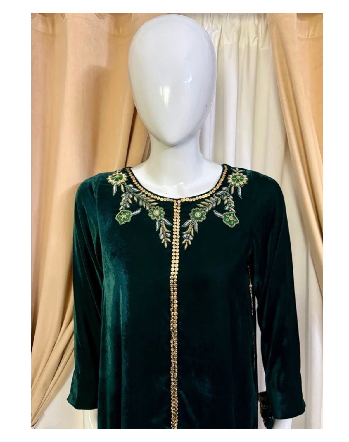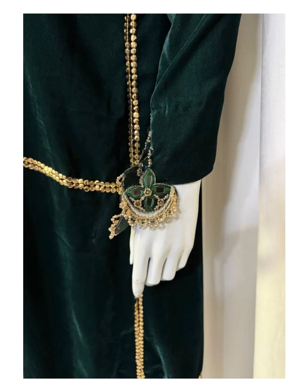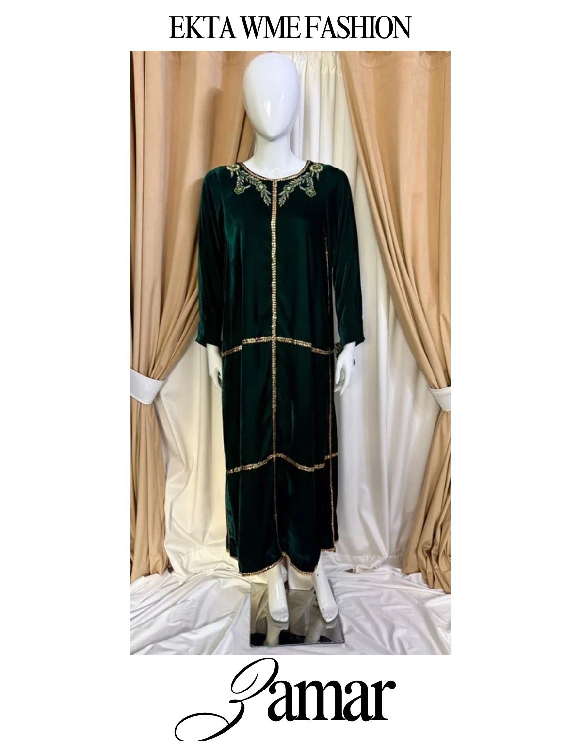 Experience the epitome of winter luxury with the Zamar long kurta by Ekta Wme Fashion. Crafted from premium, high-shine velvet in a captivating dark green, this poncho-style silhouette offers both effortless grace and a sophisticated structure.