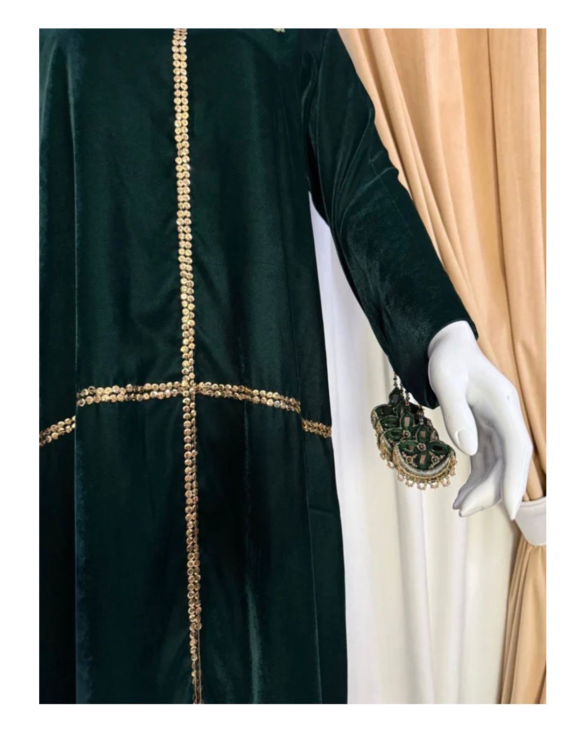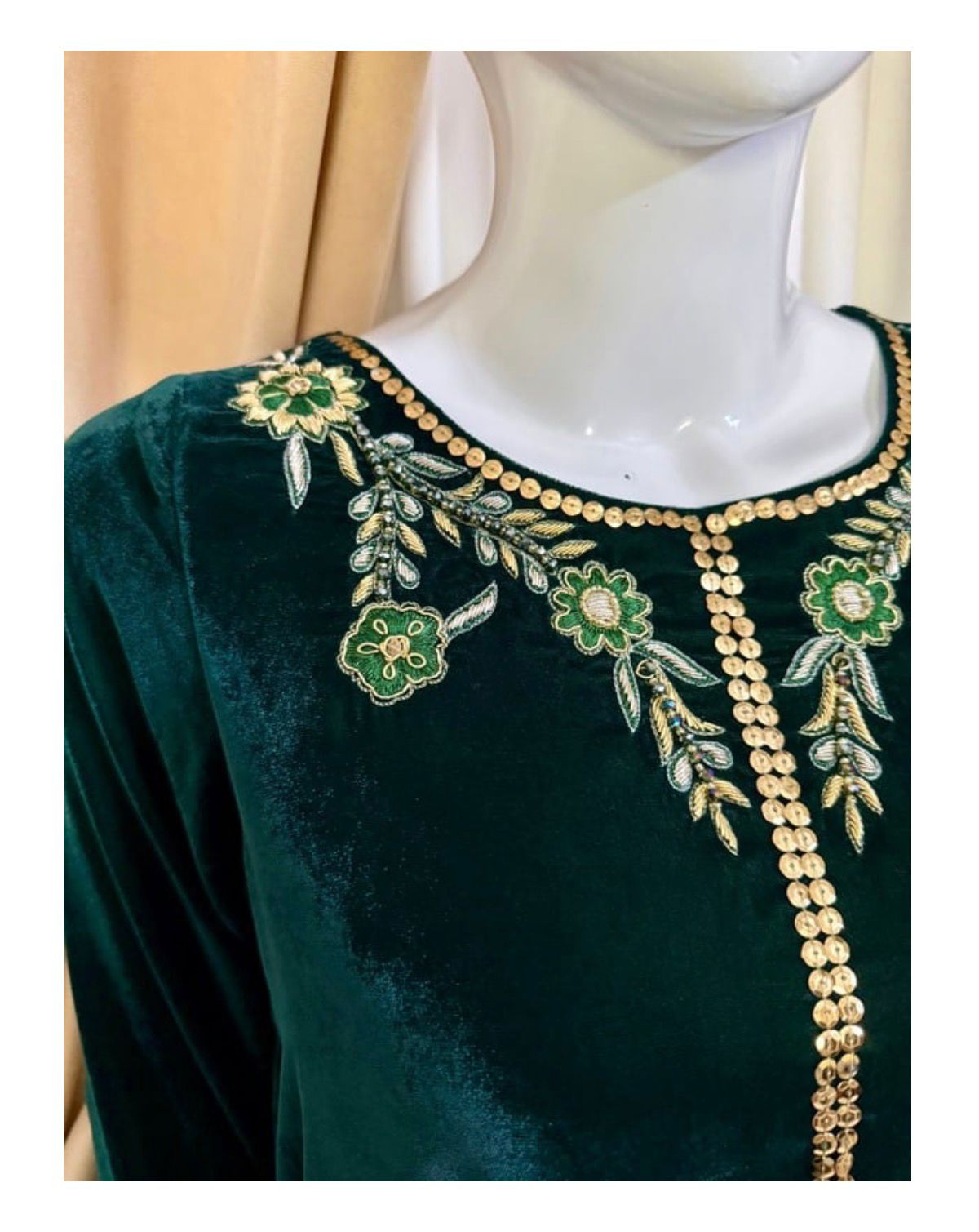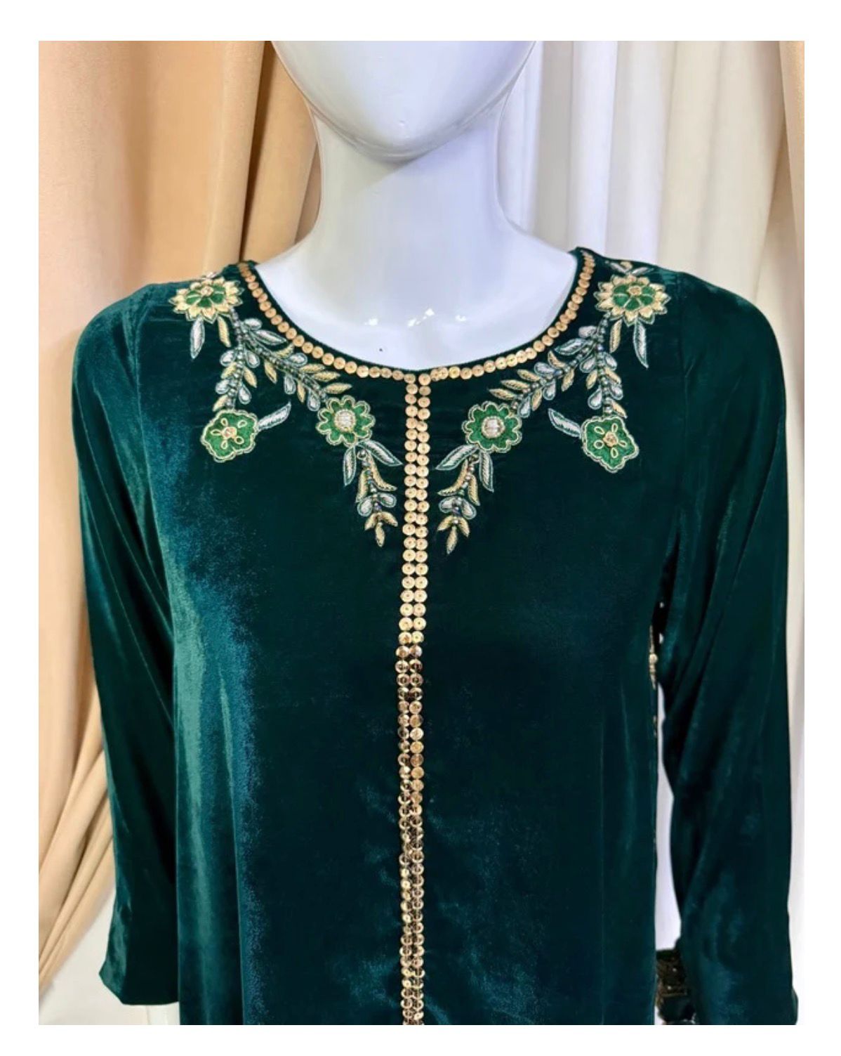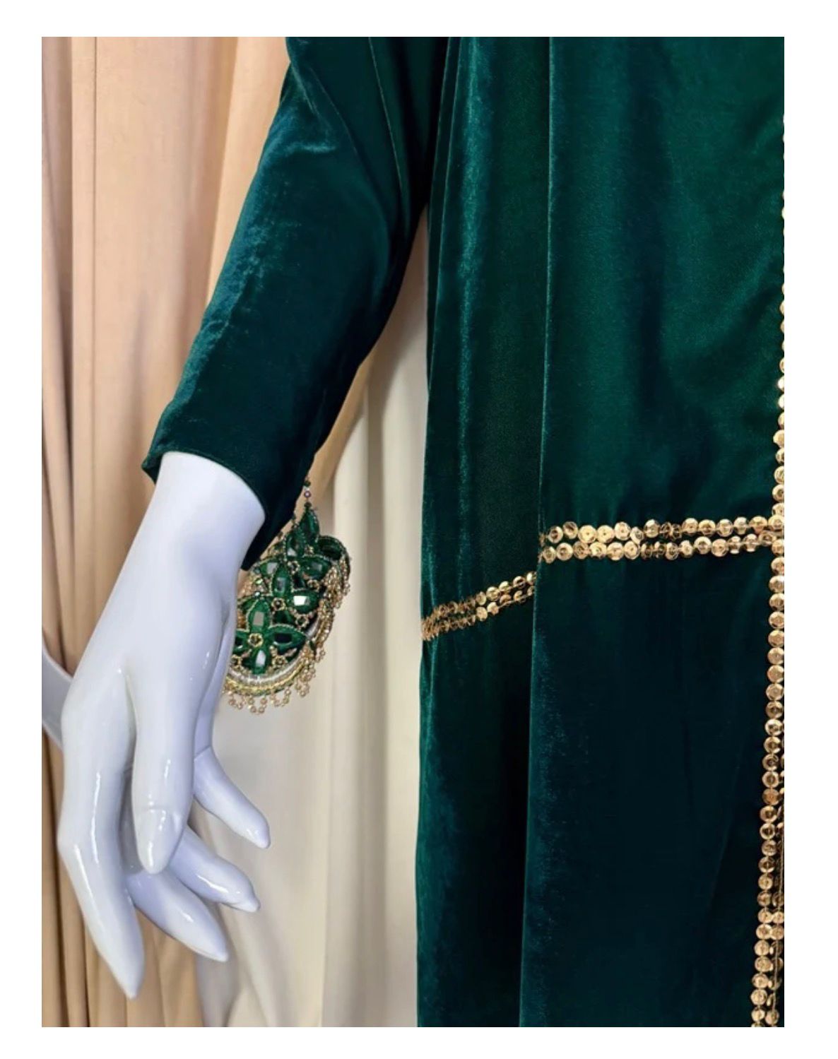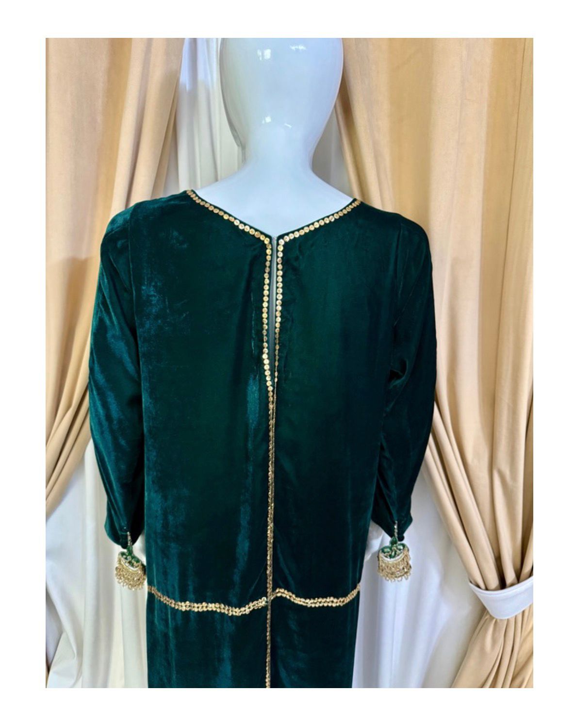 Experience the epitome of winter luxury with the Zamar long kurta by Ekta Wme Fashion. Crafted from premium, high-shine velvet in a captivating dark green, this poncho-style silhouette offers both effortless grace and a sophisticated structure.