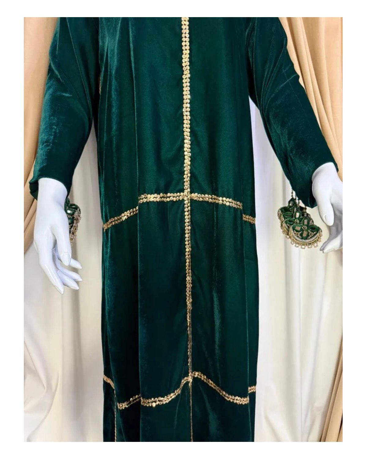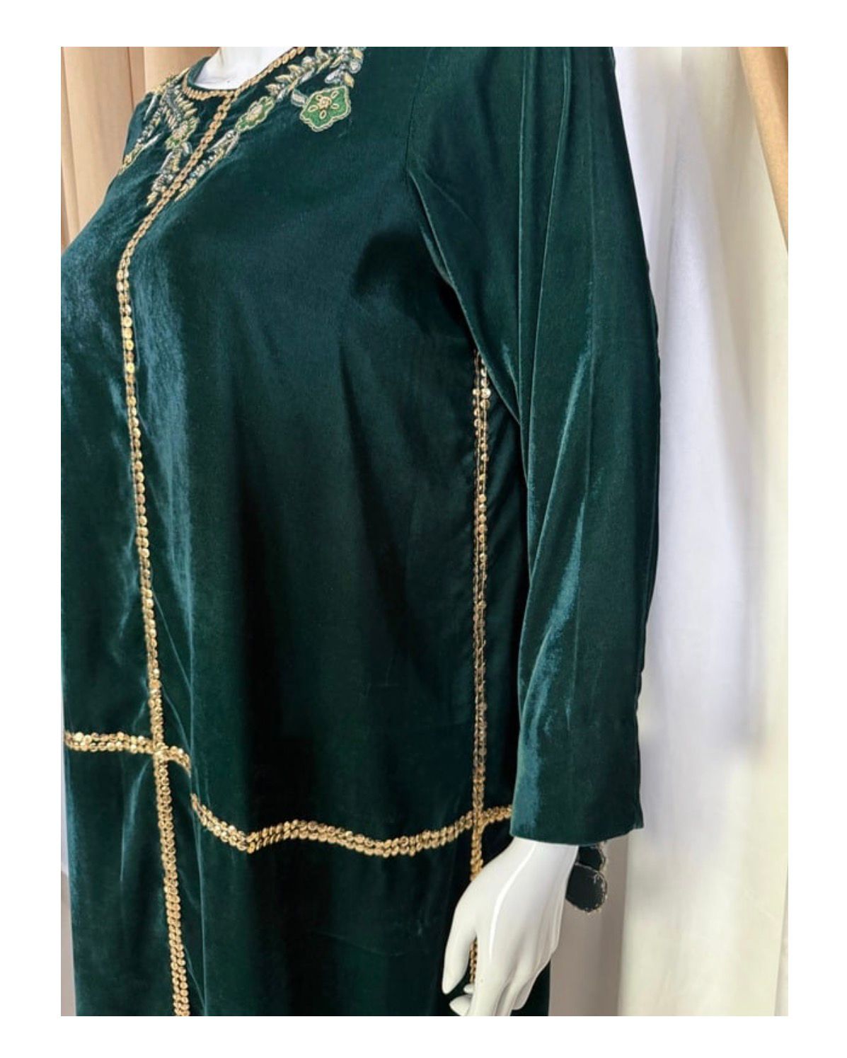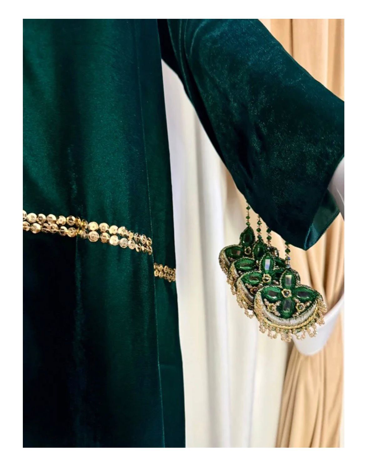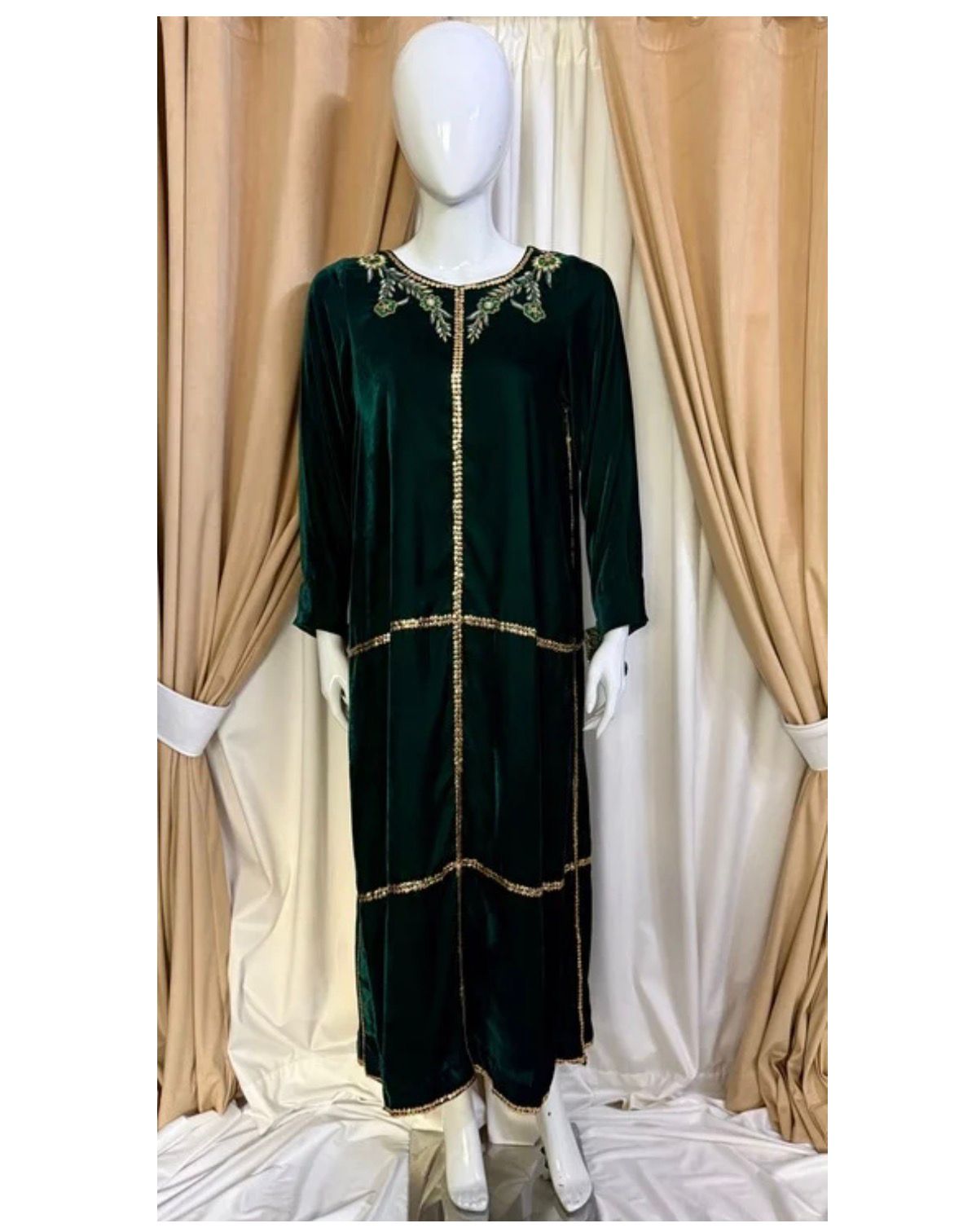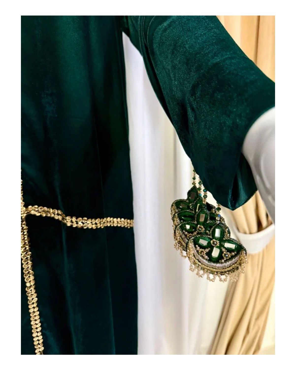 Experience the epitome of winter luxury with the Zamar long kurta by Ekta Wme Fashion. Crafted from premium, high-shine velvet in a captivating dark green, this poncho-style silhouette offers both effortless grace and a sophisticated structure.
