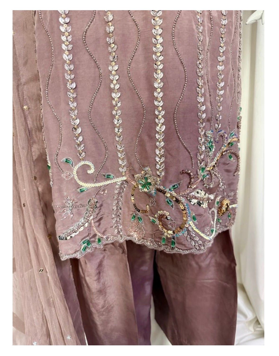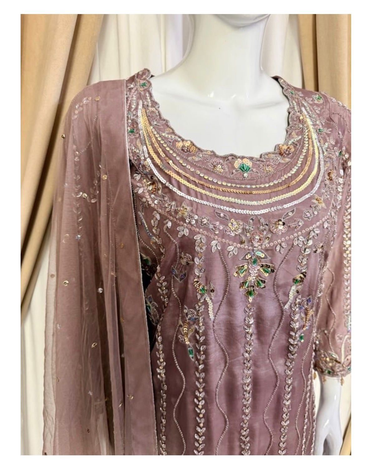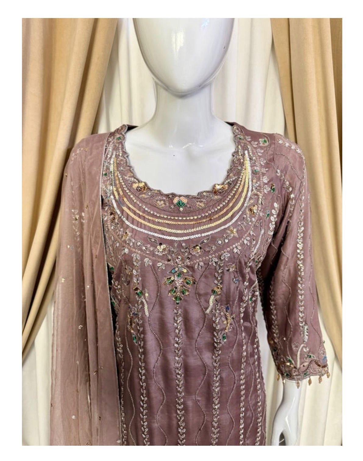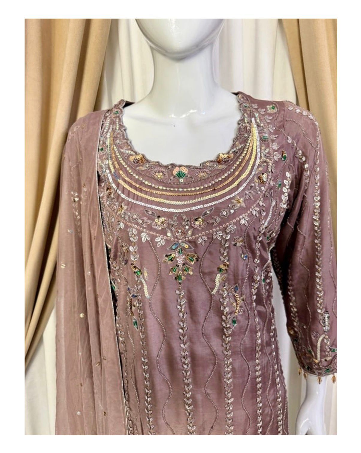 * Dupatta: A lightweight, ethereal dupatta adorned with chan to complete the look without overshadowing the craftsmanship of the shirt.