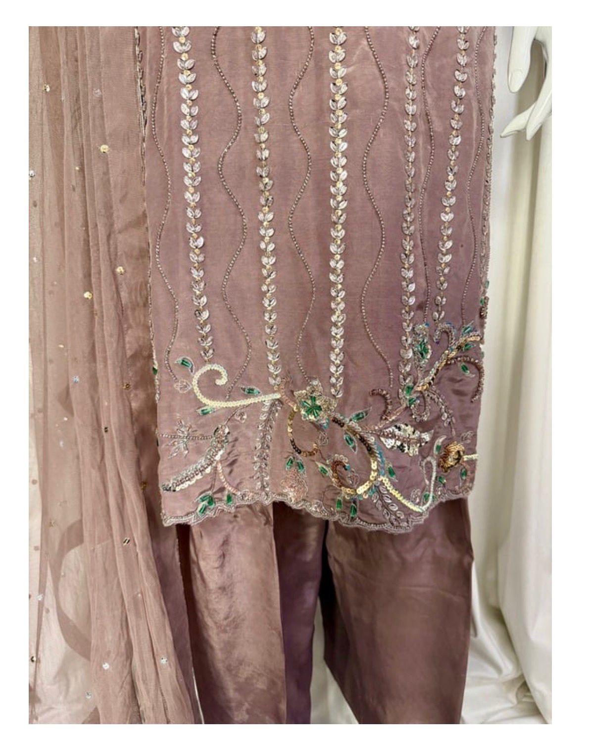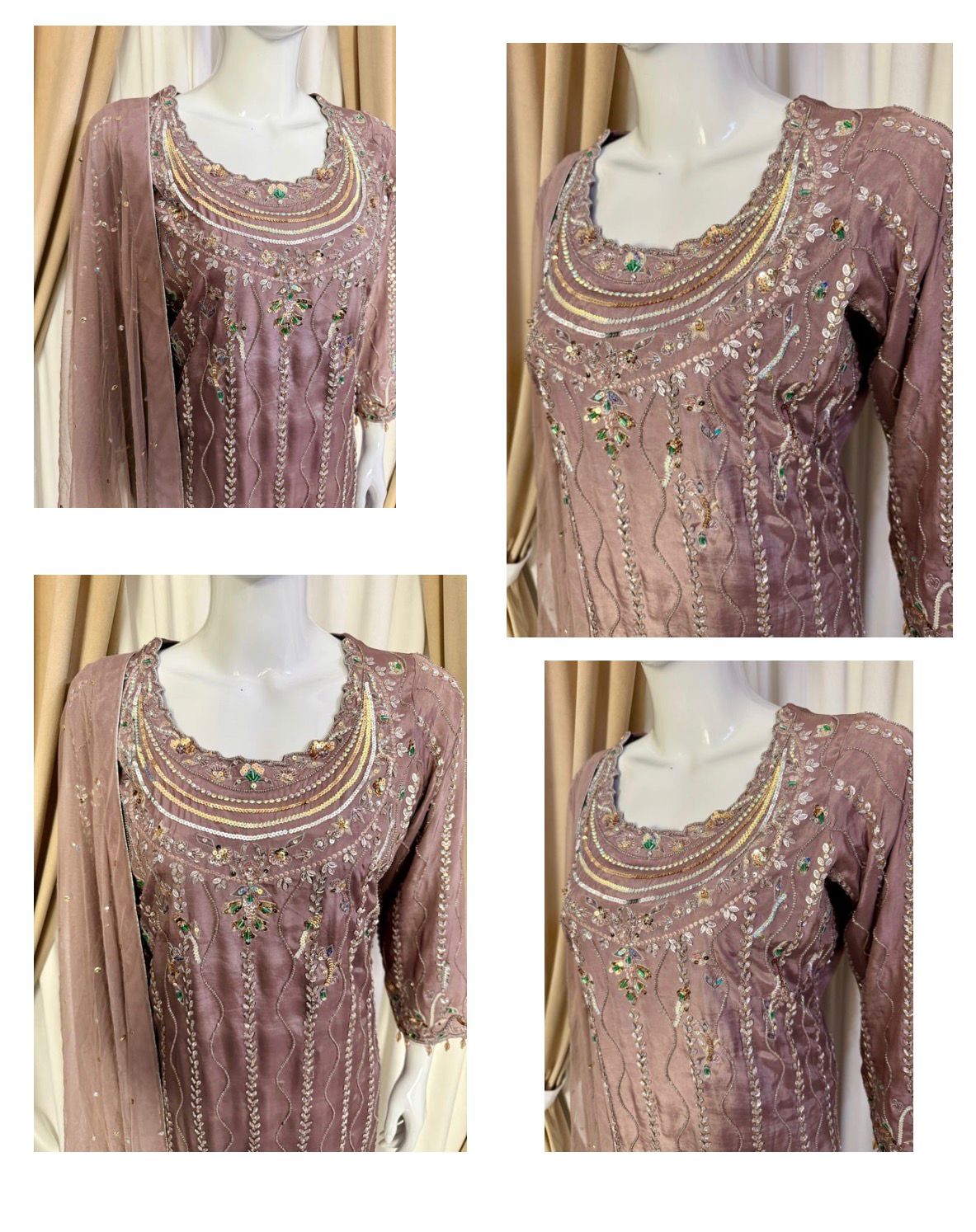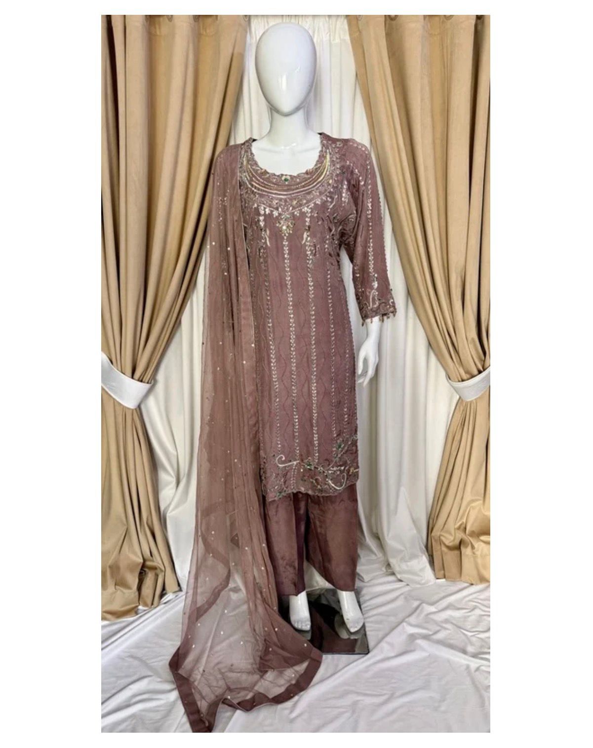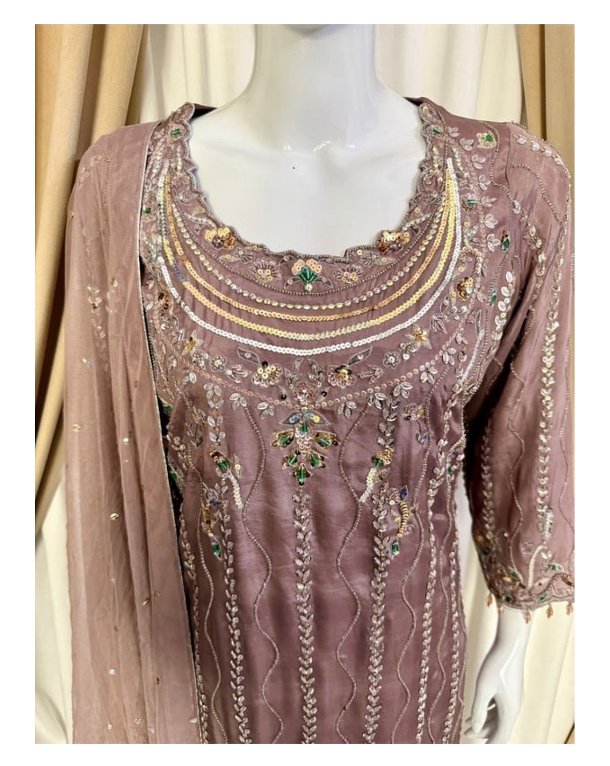 * Dupatta: A lightweight, ethereal dupatta adorned with chan to complete the look without overshadowing the craftsmanship of the shirt.