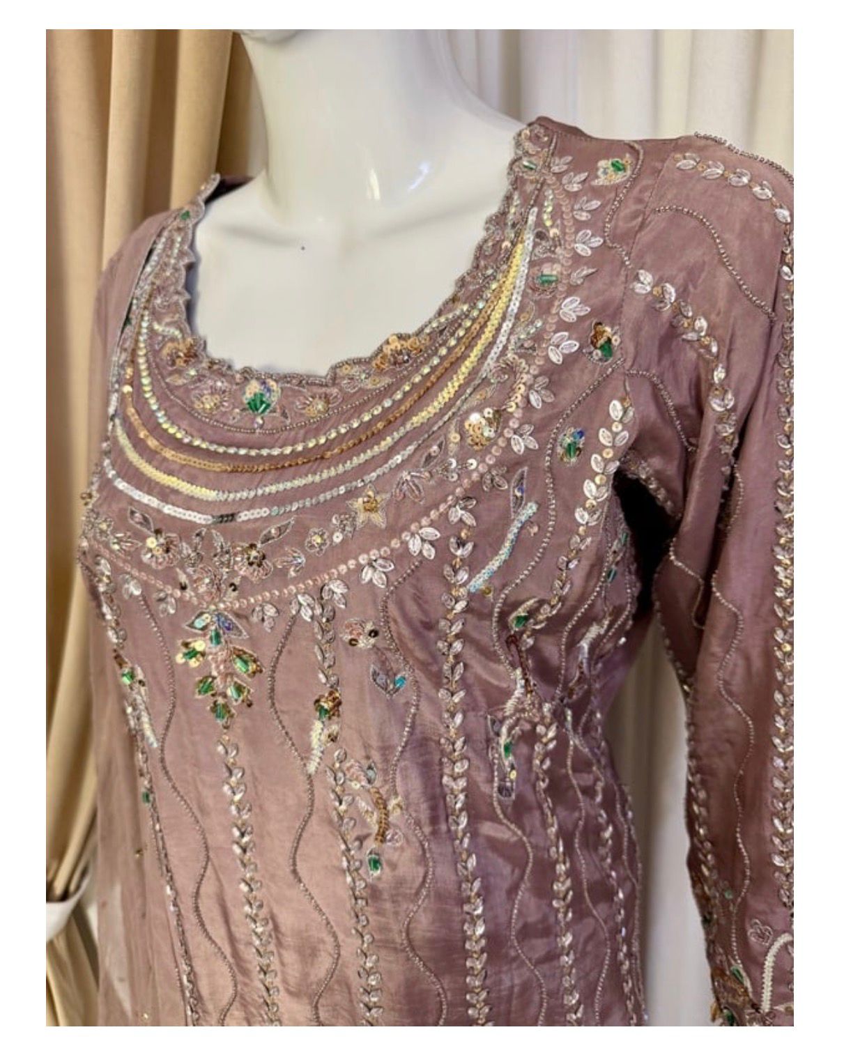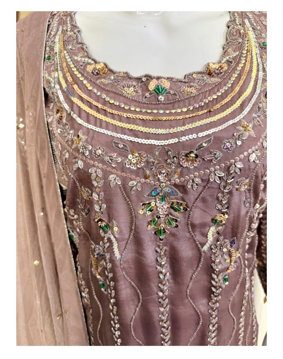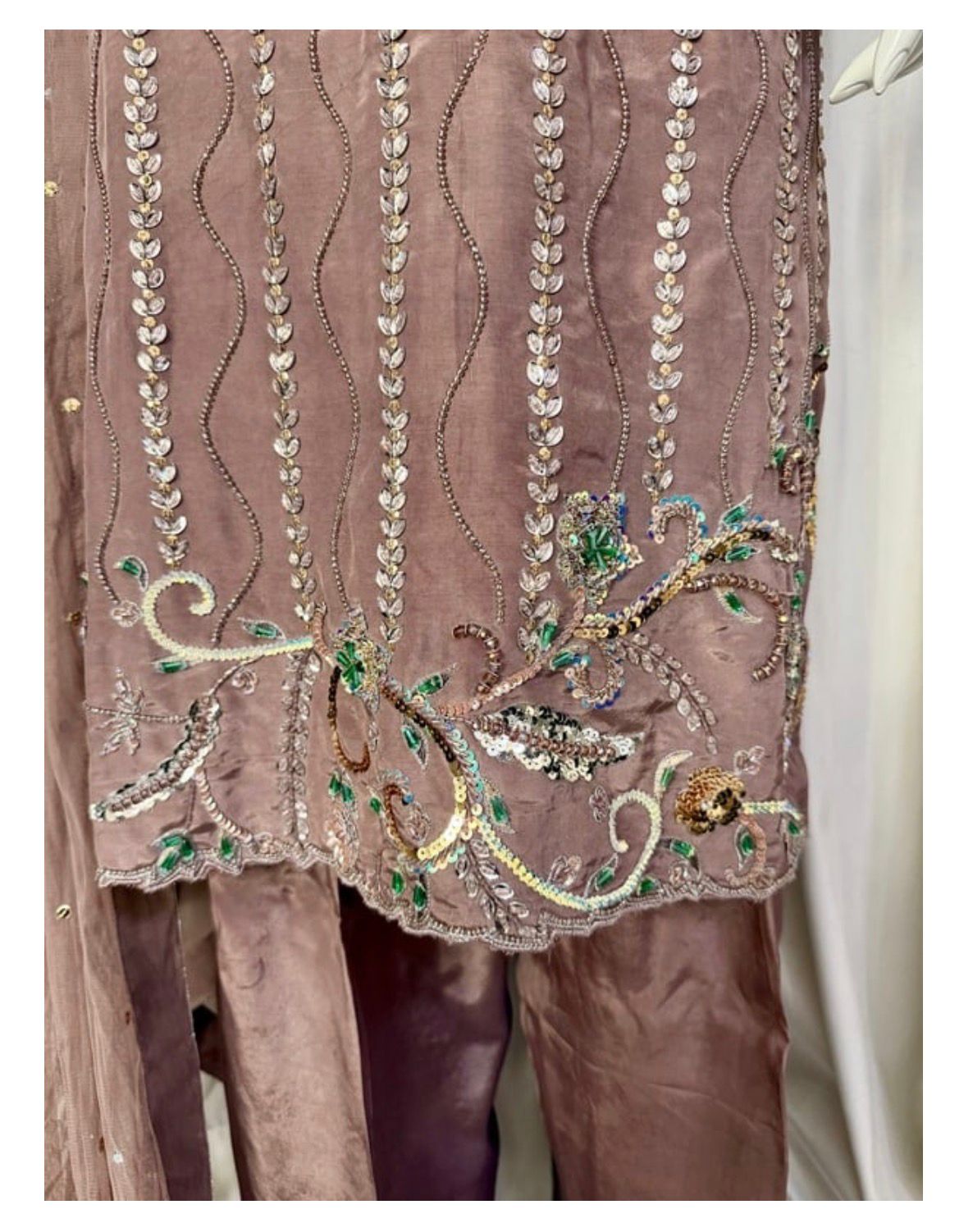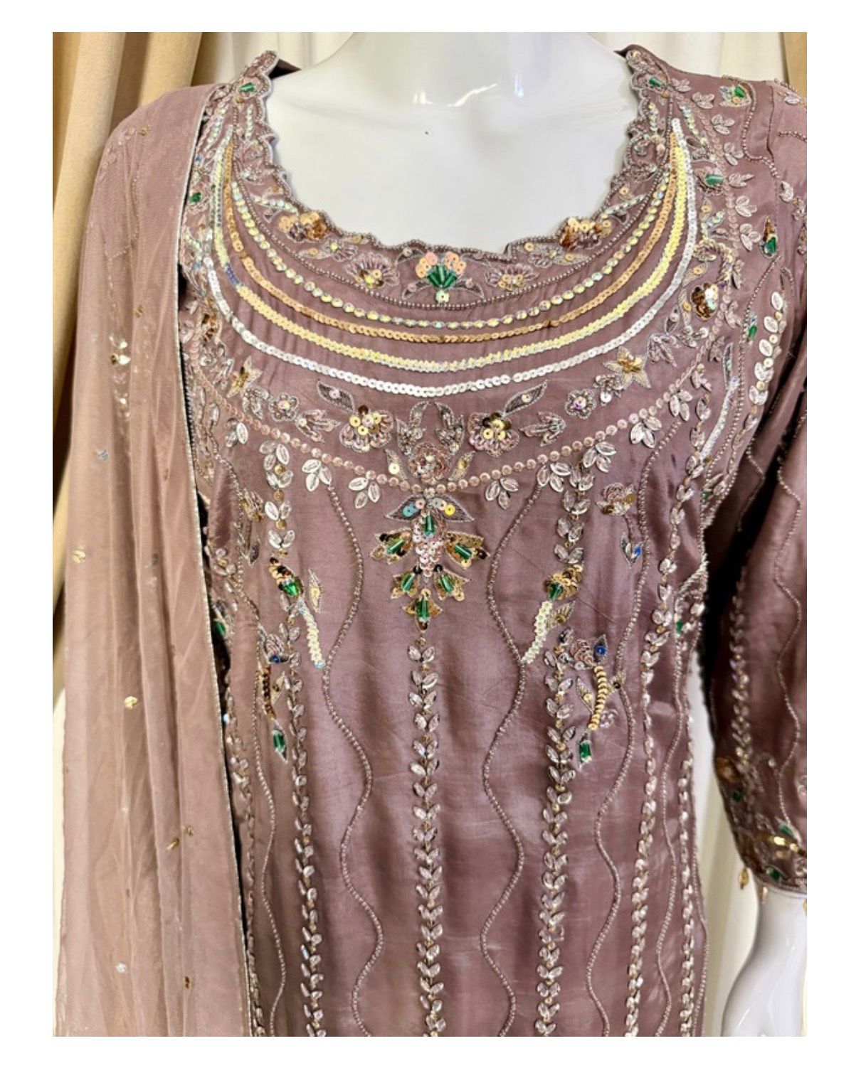 * Dupatta: A lightweight, ethereal dupatta adorned with chan to complete the look without overshadowing the craftsmanship of the shirt.