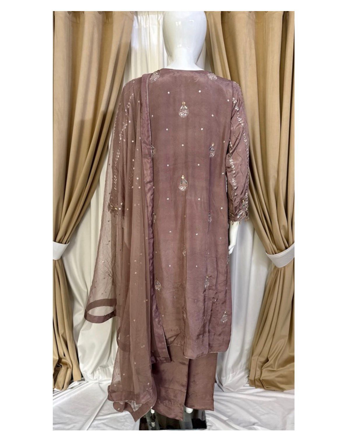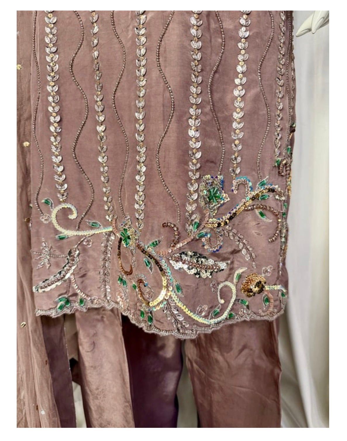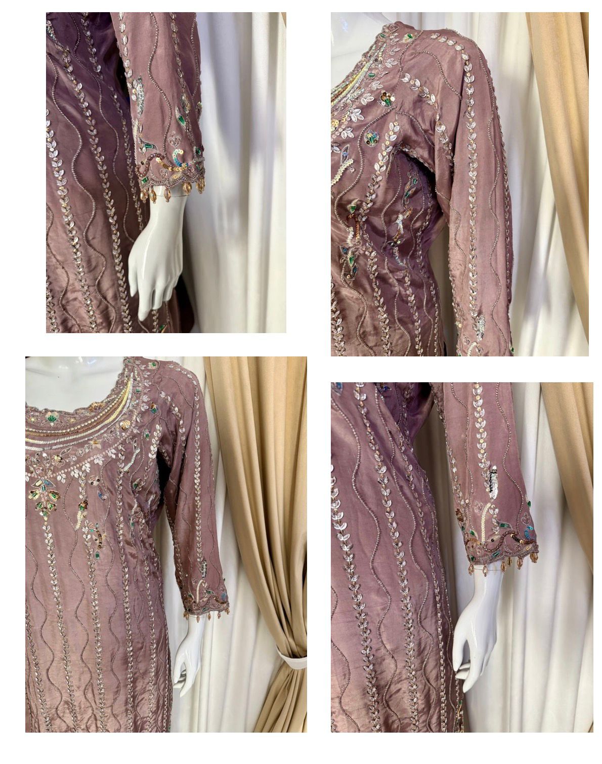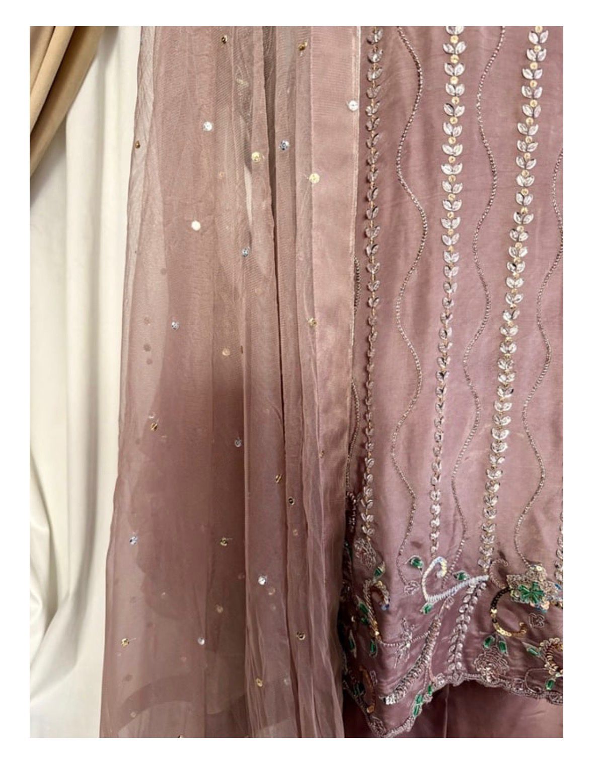 * Dupatta: A lightweight, ethereal dupatta adorned with chan to complete the look without overshadowing the craftsmanship of the shirt.
